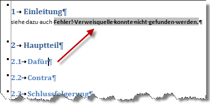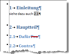 Der Querverweis wird auf "2.1 Pro" gemacht. Anschließend wird "Pro" mit "Dafür" überschrieben. Nach dem Aktualisieren findet der Querverweis die ursprüngliche Stelle nicht mehr.