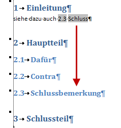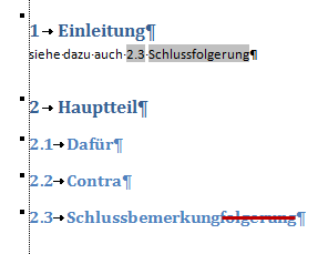 Der Querverweis wird auf "2.3 Schlussfolgerung" gesetzt und gibt Absatznummer sowie Absatztext wieder. Anfangs steht korrekt "Siehe dazu auch 2.3 Schlussfolgerung". Dann wird der Text der Überschrift von rechts her gelöscht und statt "...folgerung" wird "...bemerkung" geschrieben. Nach dem Aktualisieren wird im Querverweis nur noch "Schluss" geschrieben.