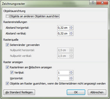 Das Gitternetz dient beim Zeichnen als Hilfsgitter - alle AutoFormen orientieren sich an dem Gitter. Standardmäßig sind die Kästchen 0,32 cm x 0,32 cm groß. Andere Abstände stellen Sie ein mit "Seitenlayout / Ausrichten / Rastereinstellungen".
