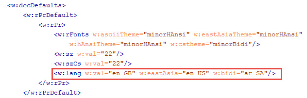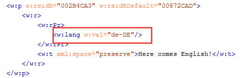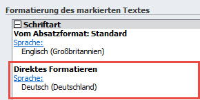 Der Formatinspektor (SHIFT+F1) zeigt mir, dass das Absatzformat Englisch liefert, aber irgendwer klammheimlich Deutsch als direkte Formatierung darüberlegt! Neugierig habe ich in XML nachgeschaut. Die Standardwerte (docDefaults) zeigen als Sprache (w:lang) den Wert Englisch (en-GB).