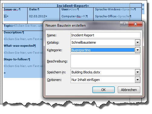 Building Blocks.dotx: benutzerdefinierter Speicherort für alle Bausteine; stehen immer zur Verfügung