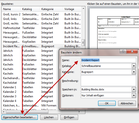 Mit "Löschen" entfernen Sie den Baustein aus der Building Blocks.dotx bzw. der Normal.dotm.