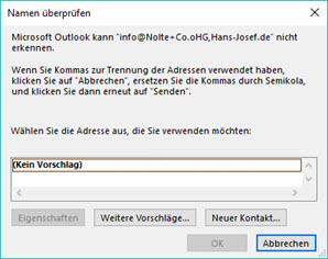 Fehlermeldungen "Namen überprüfen" haben immer mit falschen Schreibweisen der Mailanschrift zu tun: unerlaubte Zeichen wie Punkte, Komma oder Leerschritte sind in der Regel die Verursacher. Sie können sich diese Namen nur aufschreiben und später korrigieren. Klicken Sie in diesem Dialog auf "Abbrechen", damit es weitergeht. |