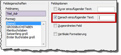 Achten Sie darauf, dass der richtige Feldname angezeigt wird (bei mir "Titel_Adr"). Klicken Sie neben "Danach einzufügender Text" und geben Sie einen Leerschritt ein. Bestätigen Sie mit OK.