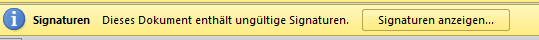 - wenn das Dokument bearbeitet und damit verändert wird. Ein Klick auf "Trotzdem bearbeiten" entfernt die Signatur.