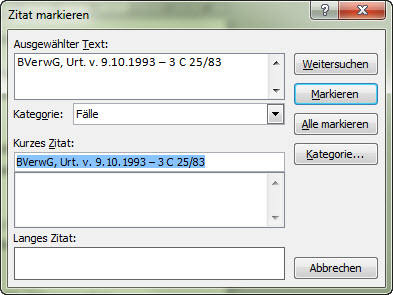 Rufen Sie mit "Verweise / Zitat festlegen" den Dialog "Zitat markieren" auf. Klicken Sie auf "Kategorien".
