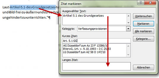 Mit Klick auf "Markieren" wird der ausgewählte Text in das Lange Zitat übertragen, das kurze Zitat ist meine Kurzform.