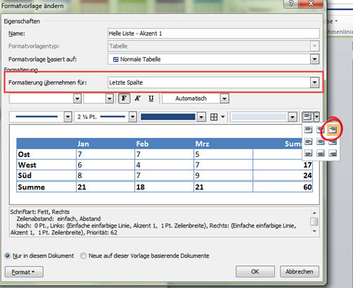 - Tabellenformatvorlage "Letzte Spalte" sagt explizit "rechtsbündig"