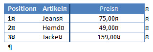 Dann wird die Ausrichtung in Preis_in_Tabelle auf "links" geändert und es gibt ein sonderbares Ergebnis: