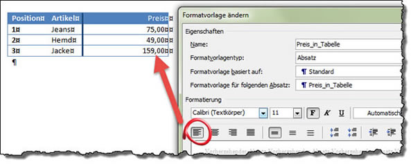Dann hat ein Anwender die Formatvorlage "Preis_in_Tabelle" erstellt und mit der Ausrichtung "zentriert" versehen. |