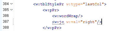 In der Definition der Tabellenformatvorlage wird für "lastCol" (Letzte Spalte) die Ausrichtung jc=right hinterlegt.