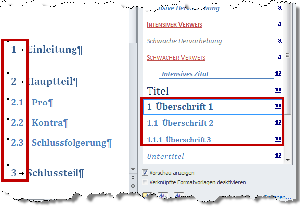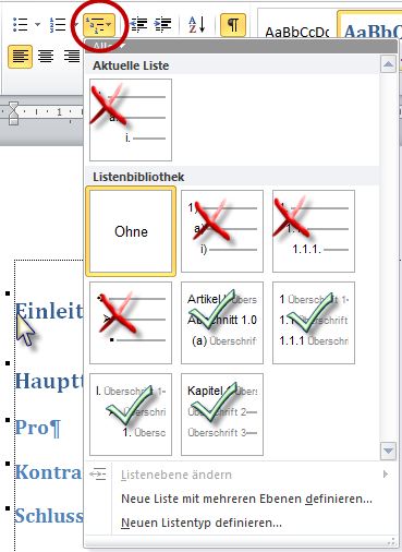 Wenn das nicht passiert, haben Sie eine der Nummerierungen gewählt, die nicht mit der Überschrifts-Formatvorlage verbunden sind (rotes Kreuz)! Fangen Sie noch mal von vorne an.