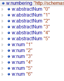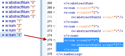 - Finden Sie heraus, welche numId und welche abstractNumId tatsächlich in Verwendung sind und welche davon "richtig" sind.
