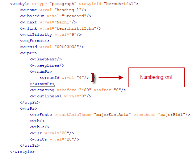 Mit der numID der Überschrift 1wird in der "numbering.xml" ermittelt, welche "abstractNumID" dahintersteckt. Hier gehört zur NumId 4 die abstract NumID 2. |