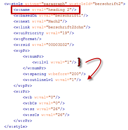 Jede Überschrift muss einen Hinweis auf den outlineLevel haben, das ist die Gliederungsebene. Sie beginnt mit 0 - Überschrift 1 hat also outlineLevel 0, Überschrift 2 hat outlineLevel 1 und so fort. Ab der zweiten Ebene muss anstelle der NumID der Wert für iLvl stehen - er ist mit dem Outline Level identisch. |