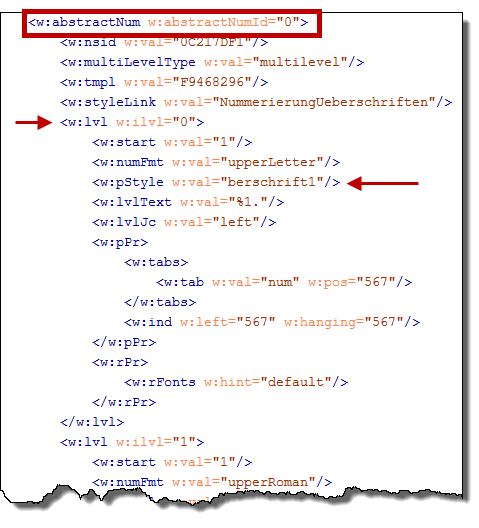 Die abstractNumId finden Sie in der Numbering.xml etwas weiter oben. In ihr sind die Nummerierungen Ebene für Ebene aufgelistet. |