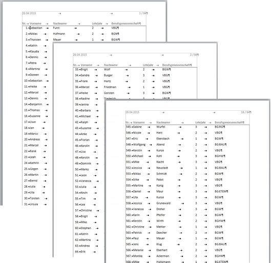 Auf der Basis eines Seriendruck-Verzeichnisses erstelle ich aus einer umfangreichen Liste mit Teilnehmer-Informationen eine Namensliste. In der echten Umgebung wird die Liste aus einer Datenbank erzeugt, die sehr viele Spalten liefert; gespeichert wird die Liste als Excel-Tabelle.