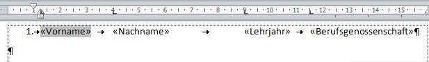 Starten Sie den Seriendruck mit "Sendungen | Seriendruck starten: Verzeichnis". Verbinden Sie das Dokument mit den Adressen. Fügen Sie die Felder, getrennt durch einen Tabulator ein. Die erste Spalte "Vorname" beginnt nicht ganz vorne, sondern auf 1 cm. Davor kommt später noch die Nummerierung. |