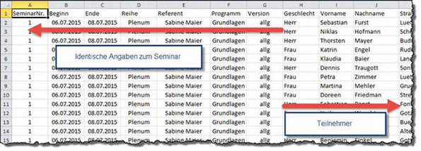 Aus einer Seminardatenbank wird eine Liste pro Seminar erzeugt. Die Liste enthält die Teilnehmernamen und weitere Angaben zum Teilnehmer (ab Spalte H) sowie für jeden Teilnehmer den Seminartitel, Beginn und Ende und den Dozenten. Diese Angaben werden für jeden Teilnehmer wiederholt (Spalten A bis G).