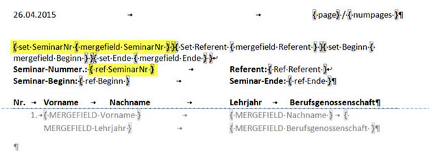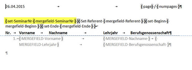 Gelb markiert habe ich die erste Feldfunktion: {SET SeminarNr {MERGEFIELD SeminarNr} }