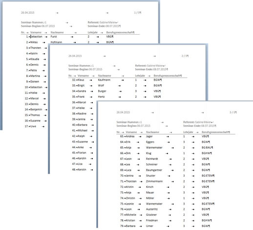 Die eigentliche Teilnehmerliste entsteht so wie unter Verzeichnis mit Überschrift in der Kopfzeile beschrieben.