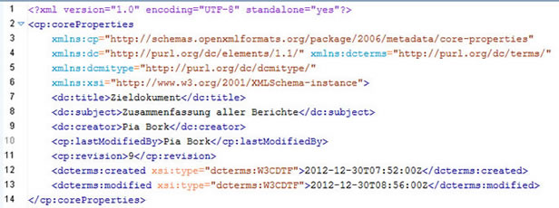 Die Eigenschaften aus den erweiterten Dateieigenschaften vom Register "Zusammenfassung" werden in der core.xml gespeichert.