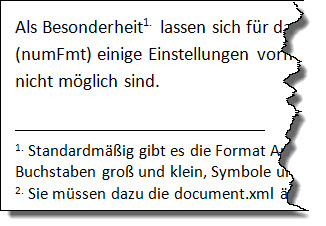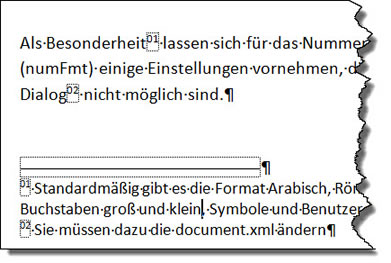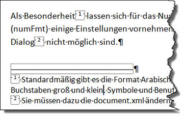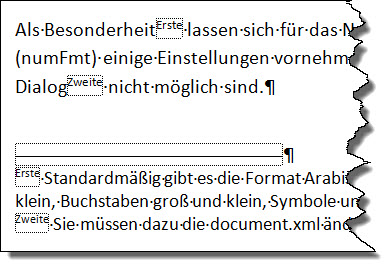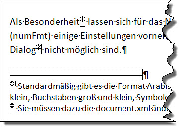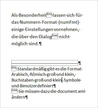 Als Besonderheit lassen sich für das Nummern-Format (numFmt) einige Einstellungen vornehmen, die über den Dialog nicht möglich sind. Im Dialog können Sie einstellen: Arabische Ziffern, Römische Ziffern in Groß und Klein, Buchstaben in Groß und Klein sowie die festlegte Reihenfolge an Sonderzeichen.