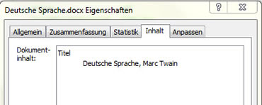 Der Titel unter "Zusammenfassung" wurde mit "Deutsche Sprache, Marc Twain" angegeben. Das zeigt sich auf dem Register "Inhalt".