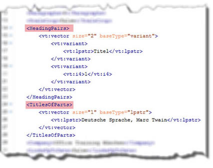 In der app.xml tauchen die beiden zusammengehörenden Elemente <HeadingPairs> und <TitlesofParts> auf, sobald Sie in den Dateieigenschaften den Titel eintragen. Dokumente ohne einen Text für den Titel in den Dateieigenschaften hat die beiden Tags nicht.