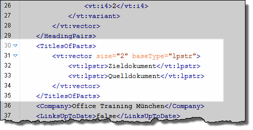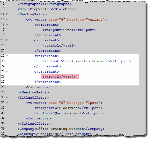 An die zweite Stelle in TitlesofParts muss der Inhalt für das zweite Titel-Element angegeben werden. Dazu wird die Zeile <vt:lpstr>Quelldokument</vt:lpstr> ergänzt. Außerdem muss auch hier die neue Anzahl in <vt:vector size="2" ...> eingetragen werden.