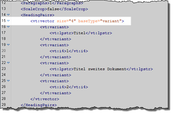 In den HeadingPairs wird mit <vt:vector size= ...> angegeben, wie viele Einträge in HeadingPairs zu erwarten sind. Anfangs steht das auf size="2" für zwei Einträge: den ersten Titel und seine zugehörige Nummer. Mit der Ergänzung sind es jetzt zwei vier Einträge: zwei Titel und zwei zugehörige Ziffern.