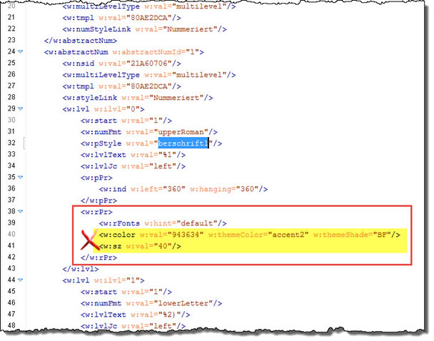 Suchen Sie nach der Formatvorlage, für die das Format der Nummer geändert wurde. Bei mir ist das die "Überschrift 1". In XML finden Sie allerdings das "Ü" nicht, die Formatvorlage heißt "berschrift1".