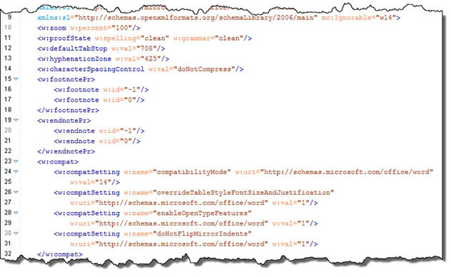 Im Ordner "word" finden Sie die Datei settings.xml. Sie nimmt alle Dokument-spezifischen Eigenschafen auf. Das sind zum Beispiel der Zoom des Dokuments, die Standard-Tabulatoren, die Silbentrennzone etc.
