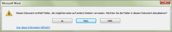 Mit dem Element updateField plus der Eigenschaft "dirty" wird beim Öffnen des Dokumentes abgefragt, ob die Felder aktualisiert werden sollen. Mit Klick auf "Ja" wird das Feld mit dem Merkmal "dirty" aktualisiert.