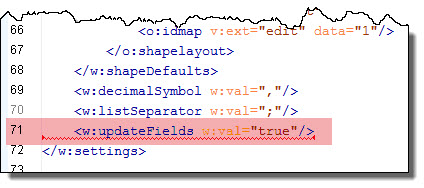 In der settings.xml wird am Ende der Datei eine Zeile für updateFields eingefügt. <w:updateFields w:val="true"/> |