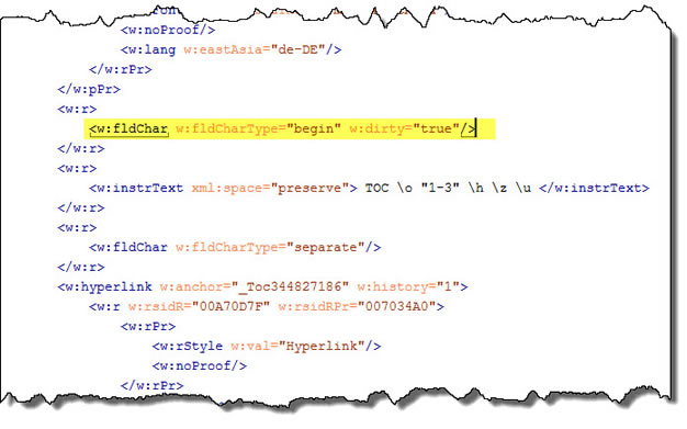 Darüber steht <w:fldChar w:fldCharType="begin">. Achtung! Eine "begin"-Zeile kommt im Inhaltsverzeichnis für jede Überschrift vor. Sie benötigen unbedingt (und nur!) die Zeile, die das Inhaltsverzeichnis beginnt.