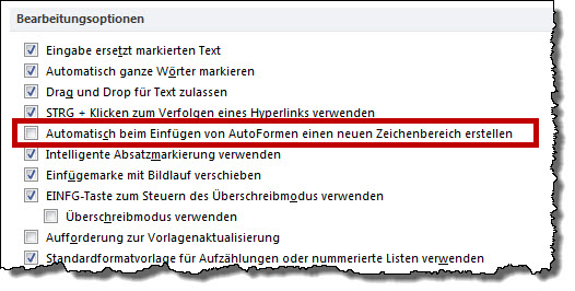 Beim Zeichnen von AutoFormen erstellt Word standardmäßig einen Zeichenbereich. Sie können das steuern über "Datei / Optionen / Erweitert" in der Rubrik "Bearbeitungsoptionen".